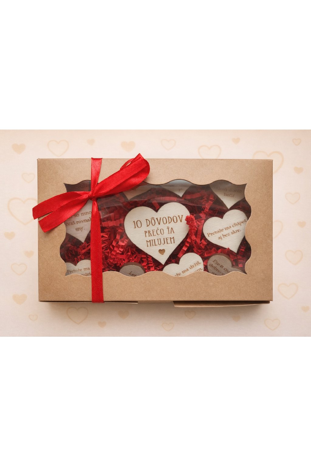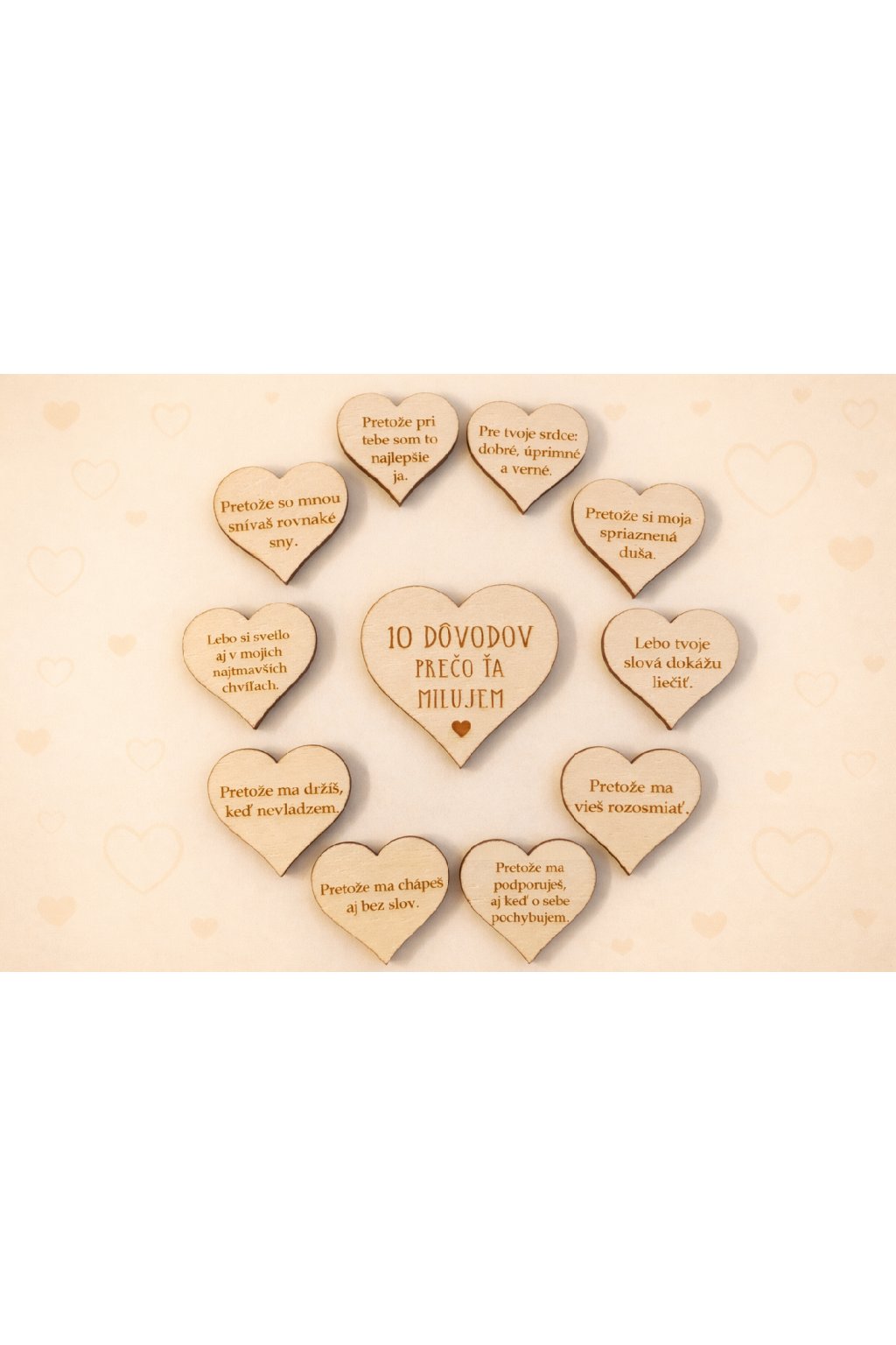 Sada obsahuje 10 menších srdiečok s gravírovanými dôvodmi lásky a 1 väčšie srdce s hlavným nápisom, ktoré celý set symbolicky spája. Texty sú precízne gravírované laserom priamo do dreva, vďaka čomu majú prirodzený vzhľad a vysokú trvácnosť.