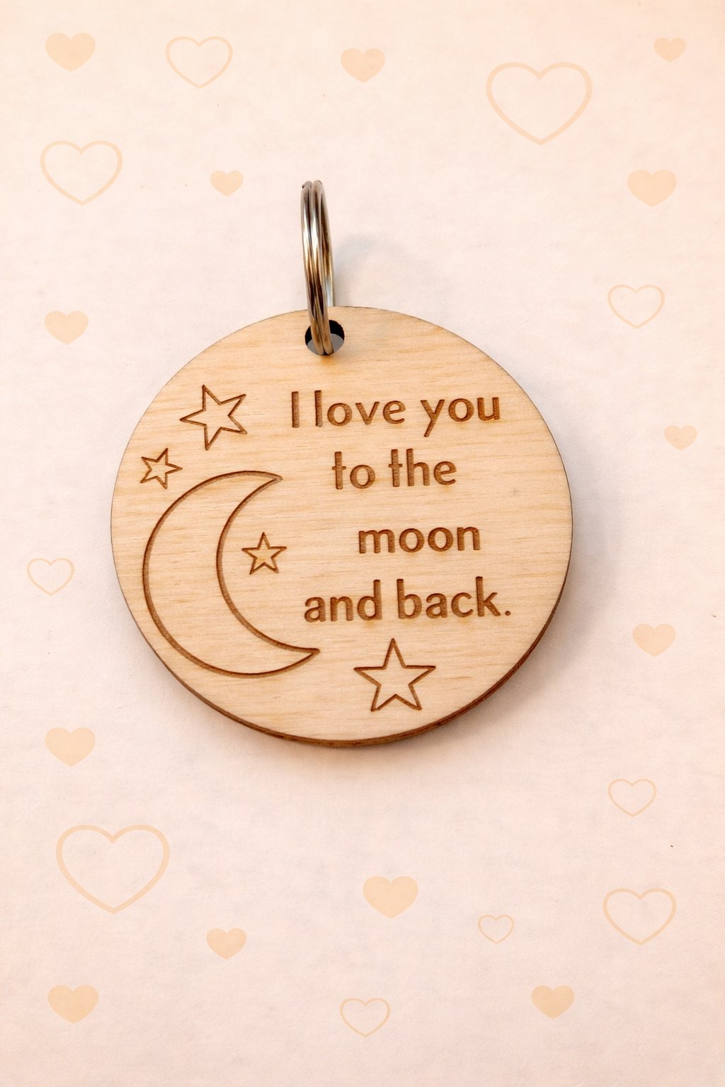 Drevená kľúčenka s gravírovaným odkazom „I love you to the moon and back“. Malý, no silný symbol lásky, ktorý môžete mať stále pri sebe. 🌙💛
