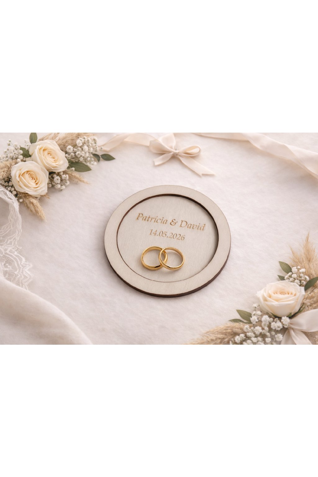 Stred podnosu je určený na uloženie svadobných obrúčok a zdobí ho personalizované gravírovanie mien snúbencov a dátumu svadby. Jednoduchý kruhový rám vytvára jemný dekoratívny prvok a zároveň zvýrazňuje gravírovaný text a obrúčky.