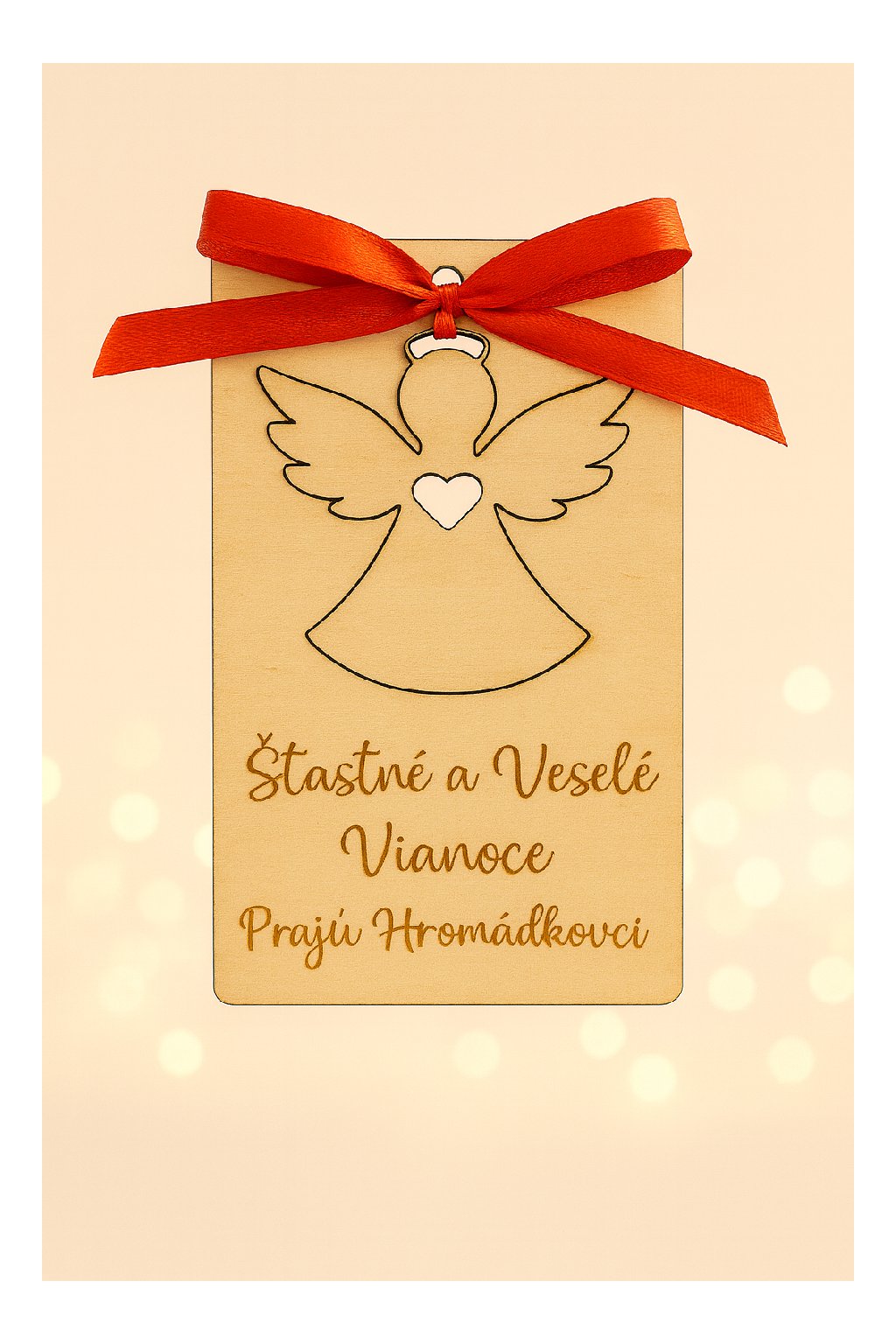 Originálna drevená vianočná pohľadnica, ktorá po doručení slúži aj ako milá vianočná ozdoba. Predná strana obsahuje vyrezávaný motív anjela a laserom gravírovaný vianočný text. Pohľadnica je doplnená elegantnou červenou stužkou, vďaka ktorej si ju obdarovaný môže zavesiť na stromček alebo použiť ako dekoráciu v interiéri. Ideálny spôsob, ako spojiť osobné prianie s trvalou spomienkou na Vianoce.