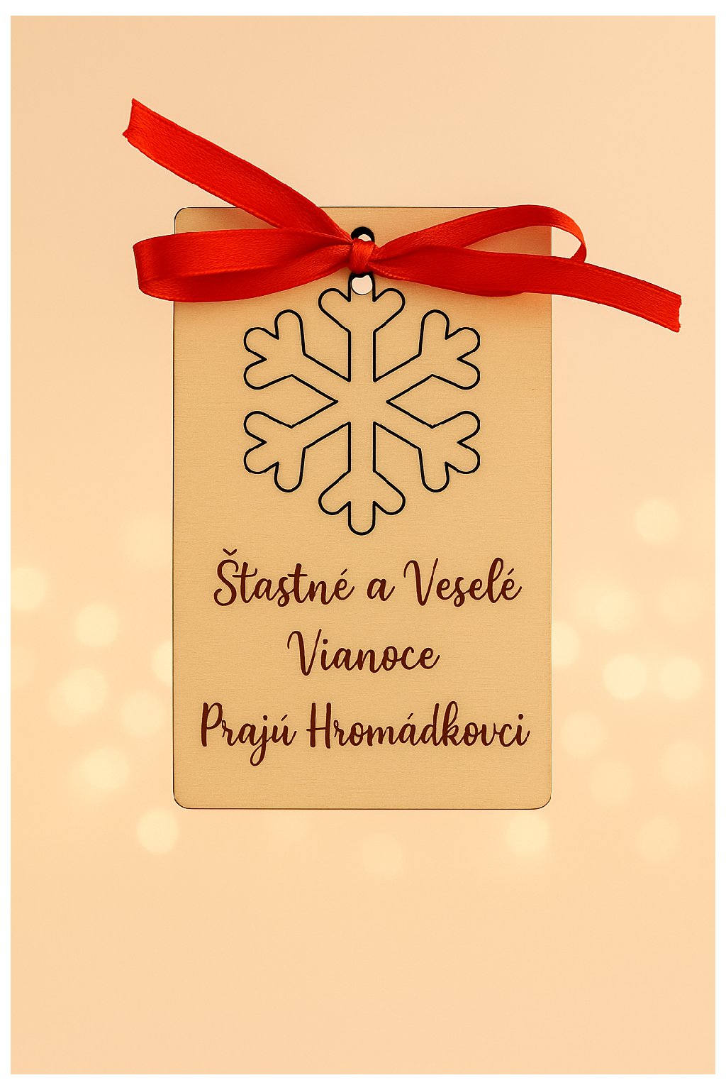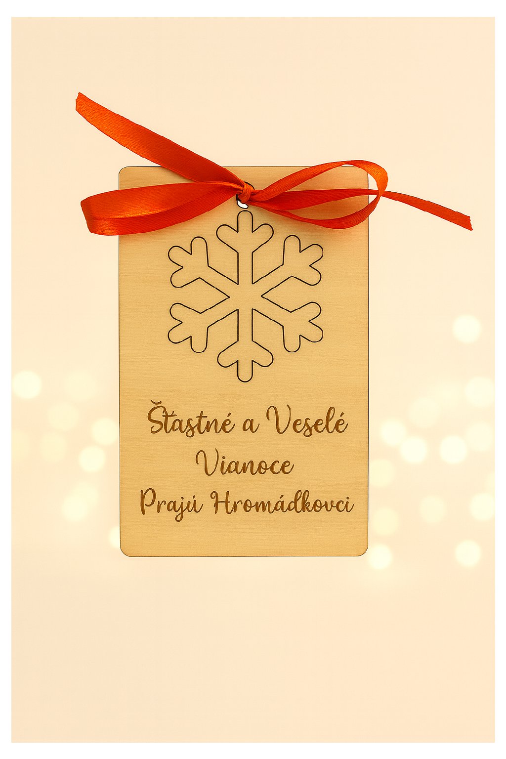 Originálna drevená vianočná pohľadnica, ktorá po doručení slúži aj ako milá vianočná ozdoba. Predná strana obsahuje vyrezávaný motív vločky a laserom gravírovaný vianočný text. Pohľadnica je doplnená elegantnou červenou stužkou, vďaka ktorej si ju obdarovaný môže zavesiť na stromček alebo použiť ako dekoráciu v interiéri. Ideálny spôsob, ako spojiť osobné prianie s trvalou spomienkou na Vianoce.