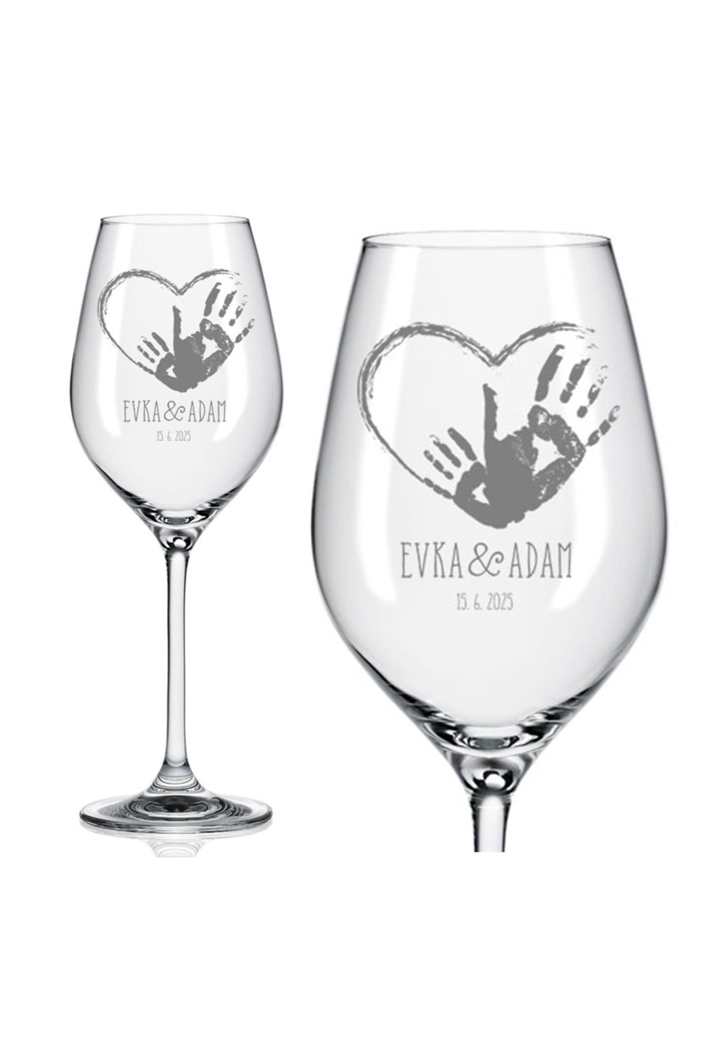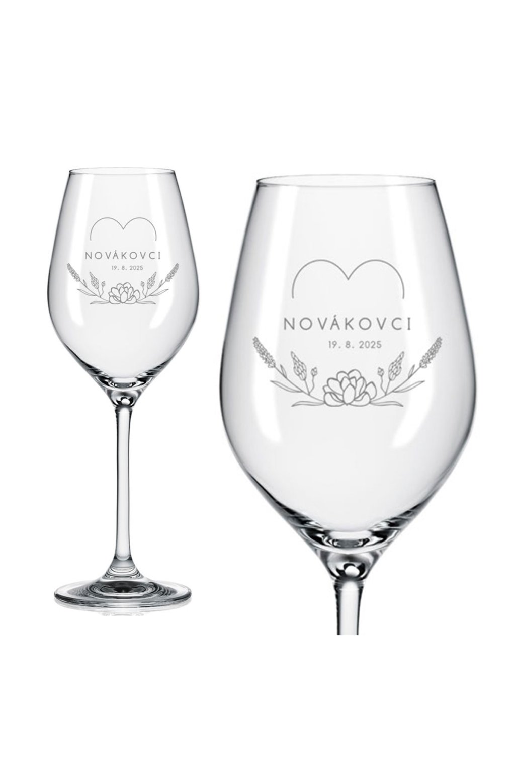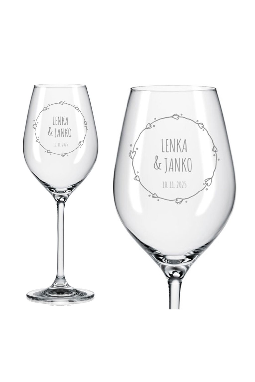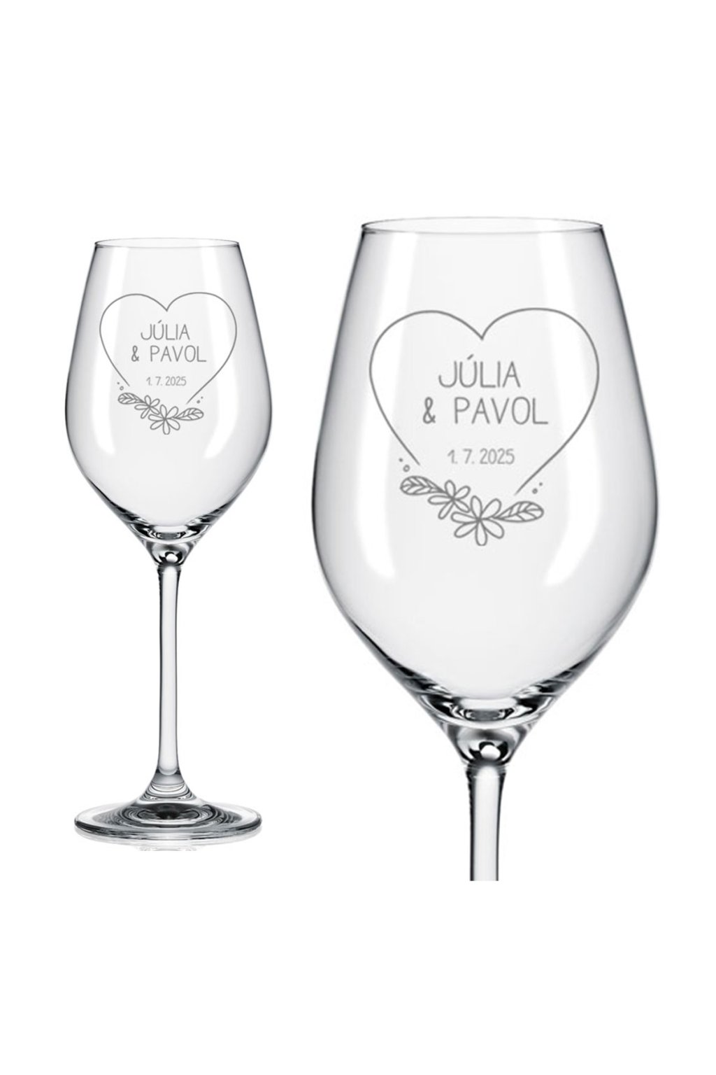 Elegantné poháre na biele víno s vysokou nožičkou a originálnym tvarom kalicha sú ideálne na svadbu alebo ako dar pre novomanželov. Objem: 360 ml.