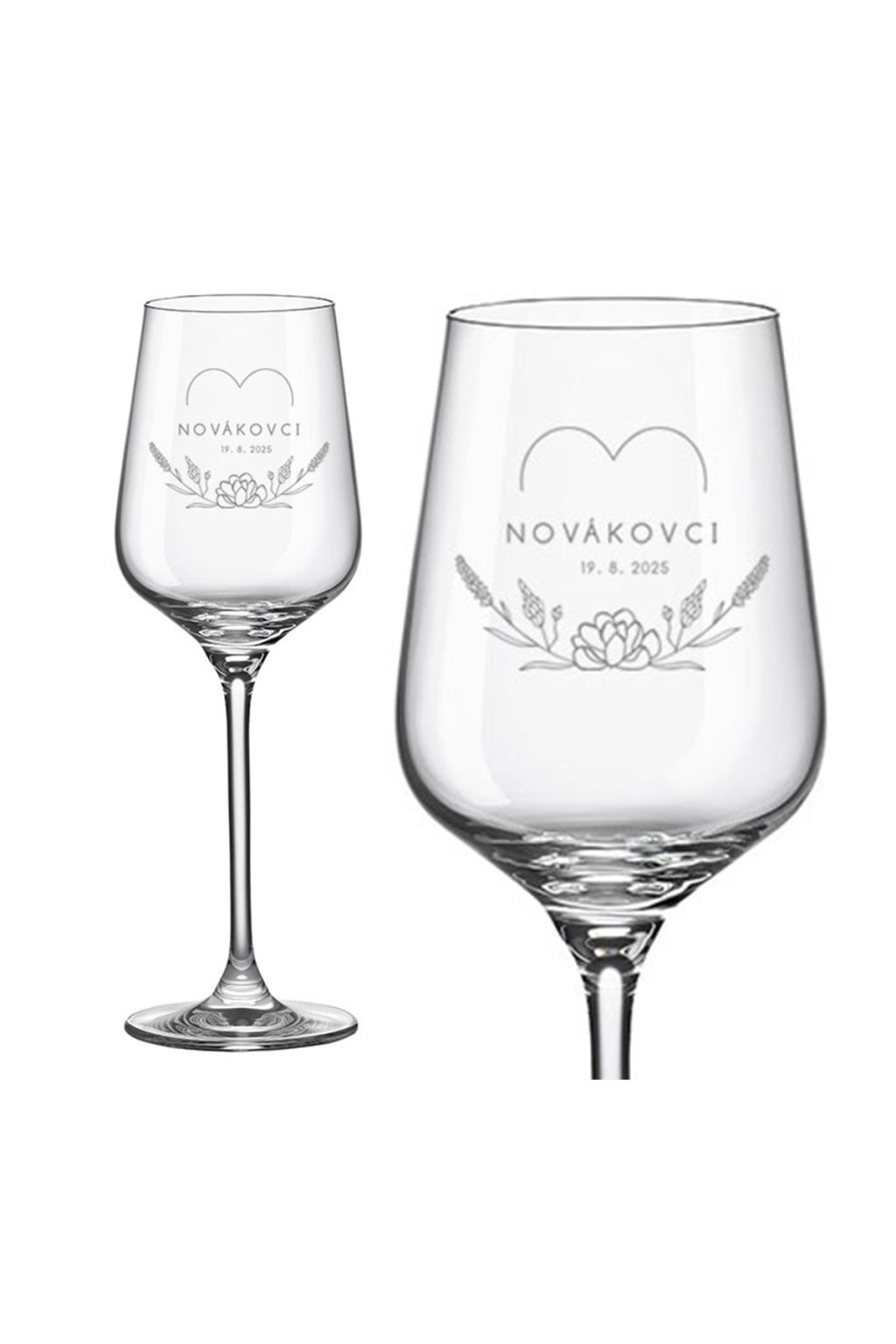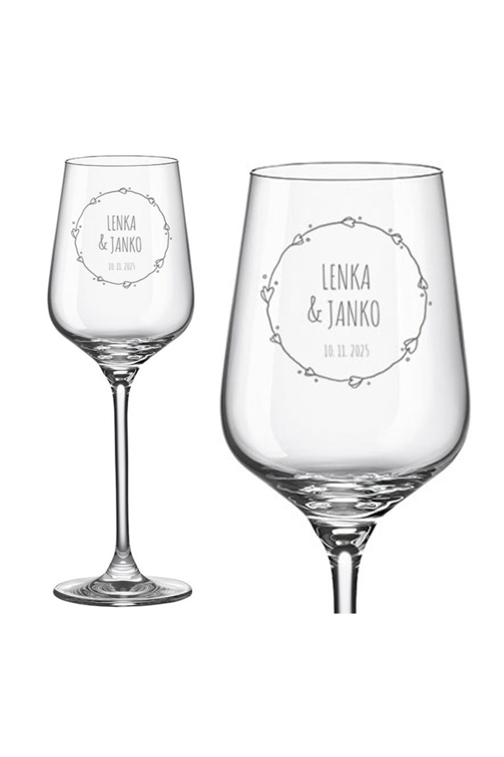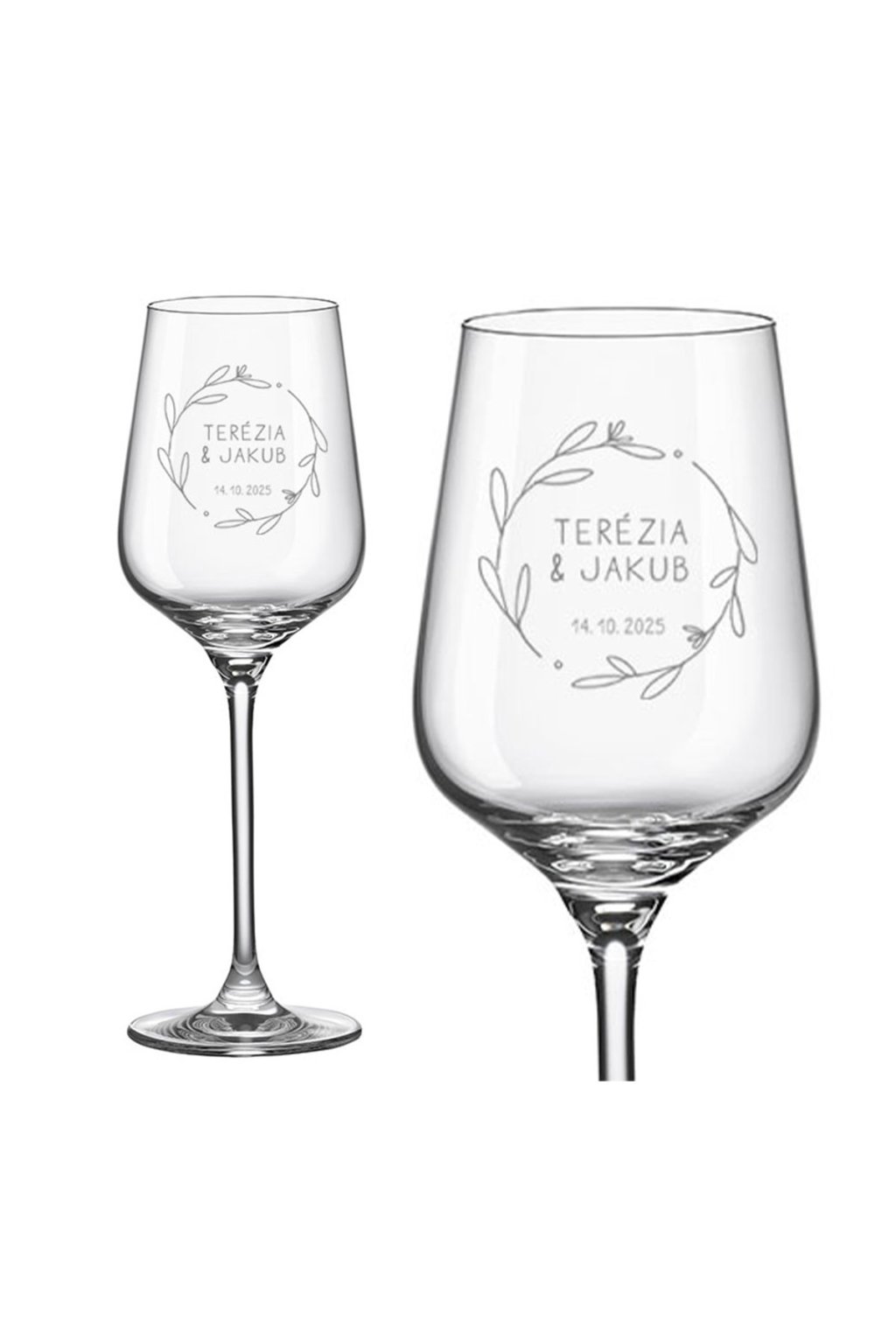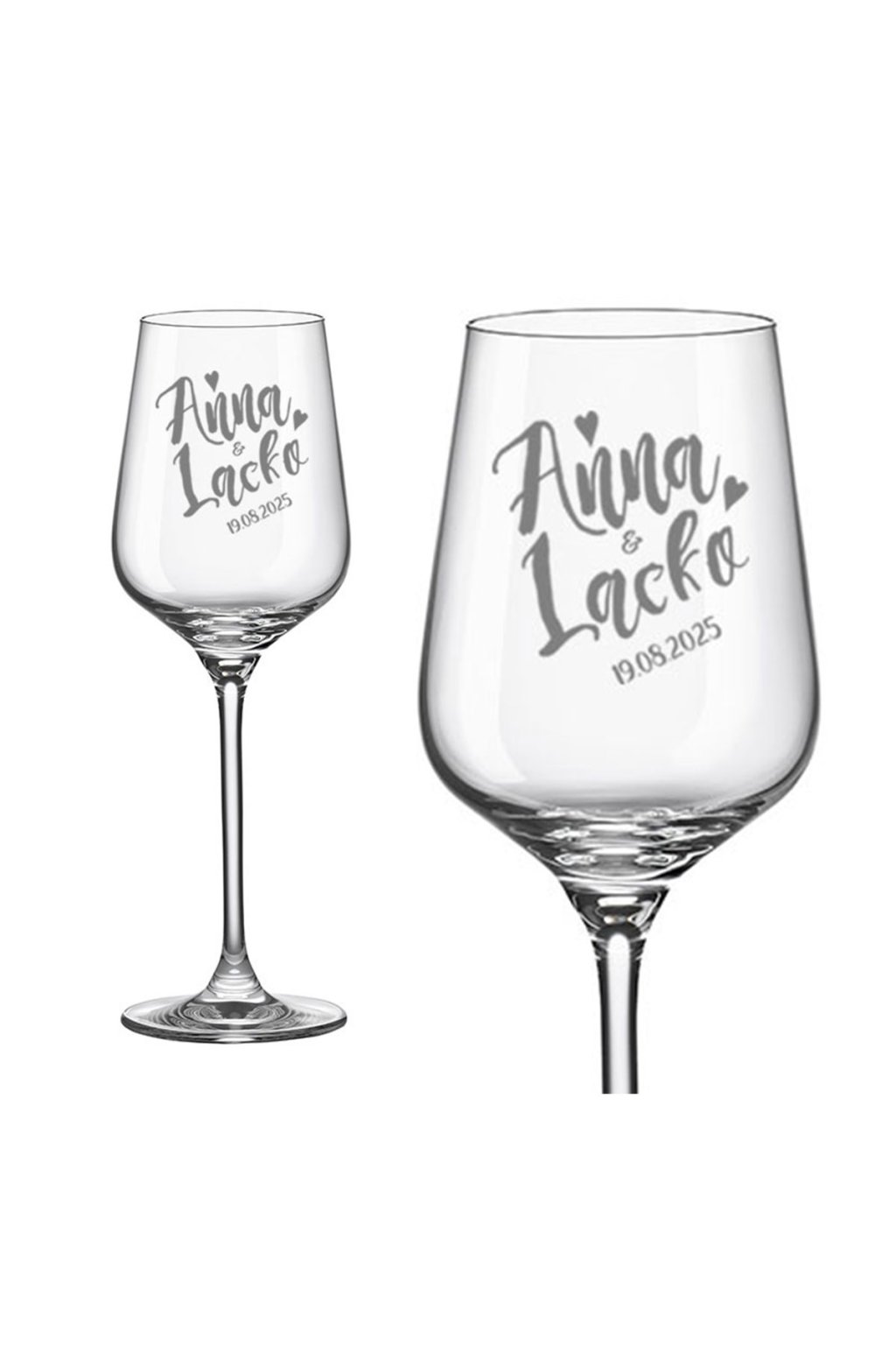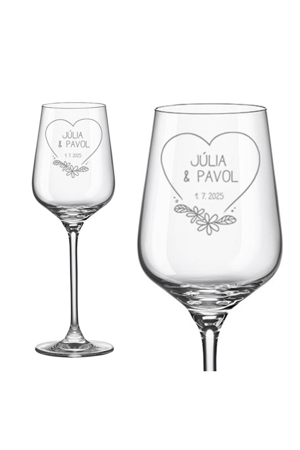 Elegantné poháre na biele víno s vysokou nožičkou a originálnym tvarom kalicha sú ideálne na svadbu alebo ako dar pre novomanželov. Objem: 350 ml.
