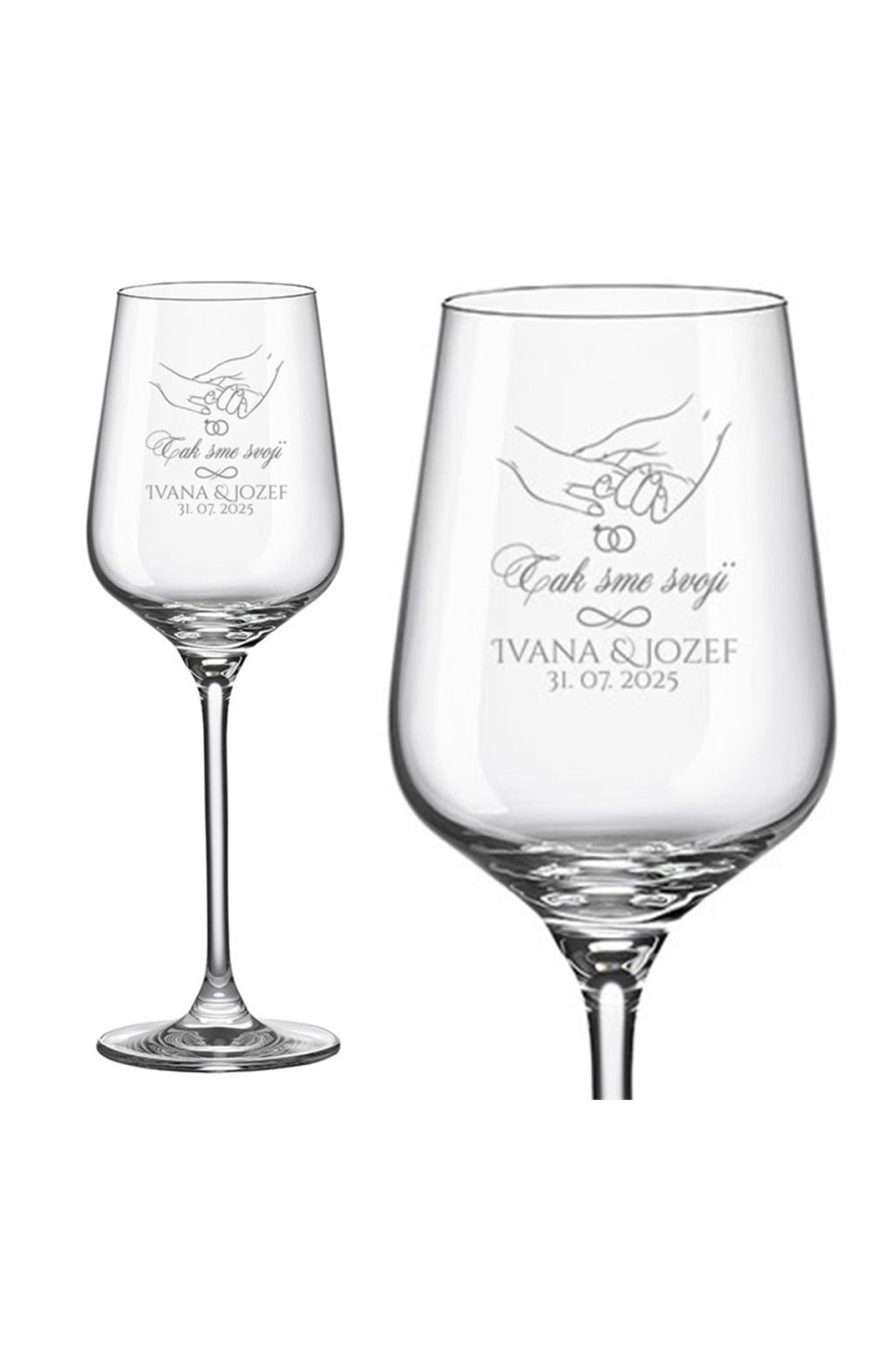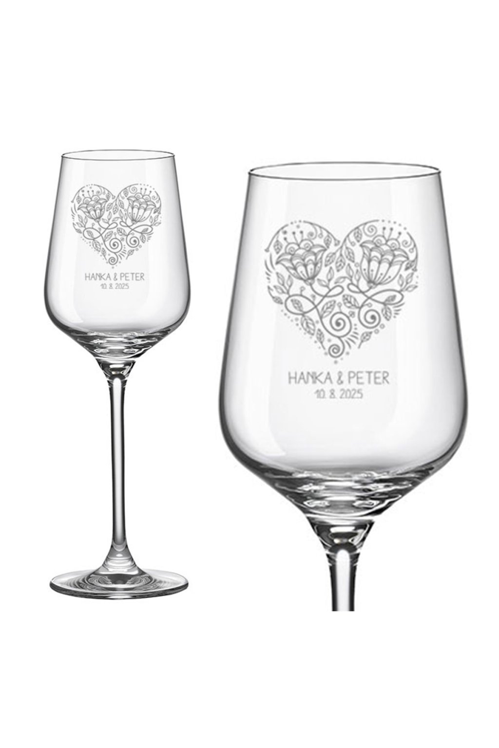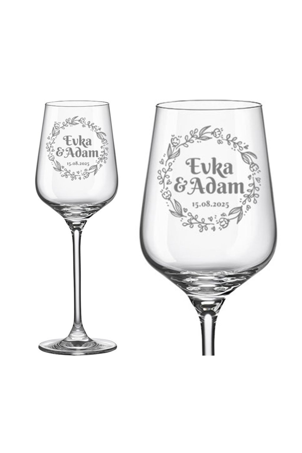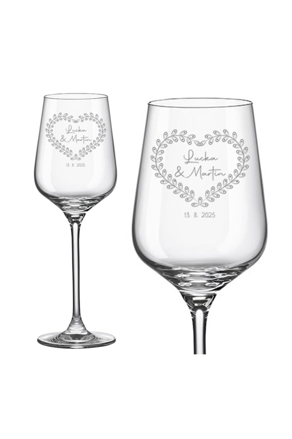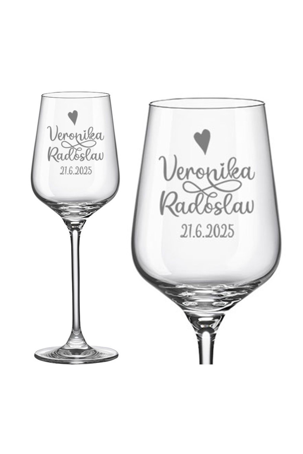 Elegantné poháre na biele víno s vysokou nožičkou a originálnym tvarom kalicha sú ideálne na svadbu alebo ako dar pre novomanželov. Objem: 350 ml.