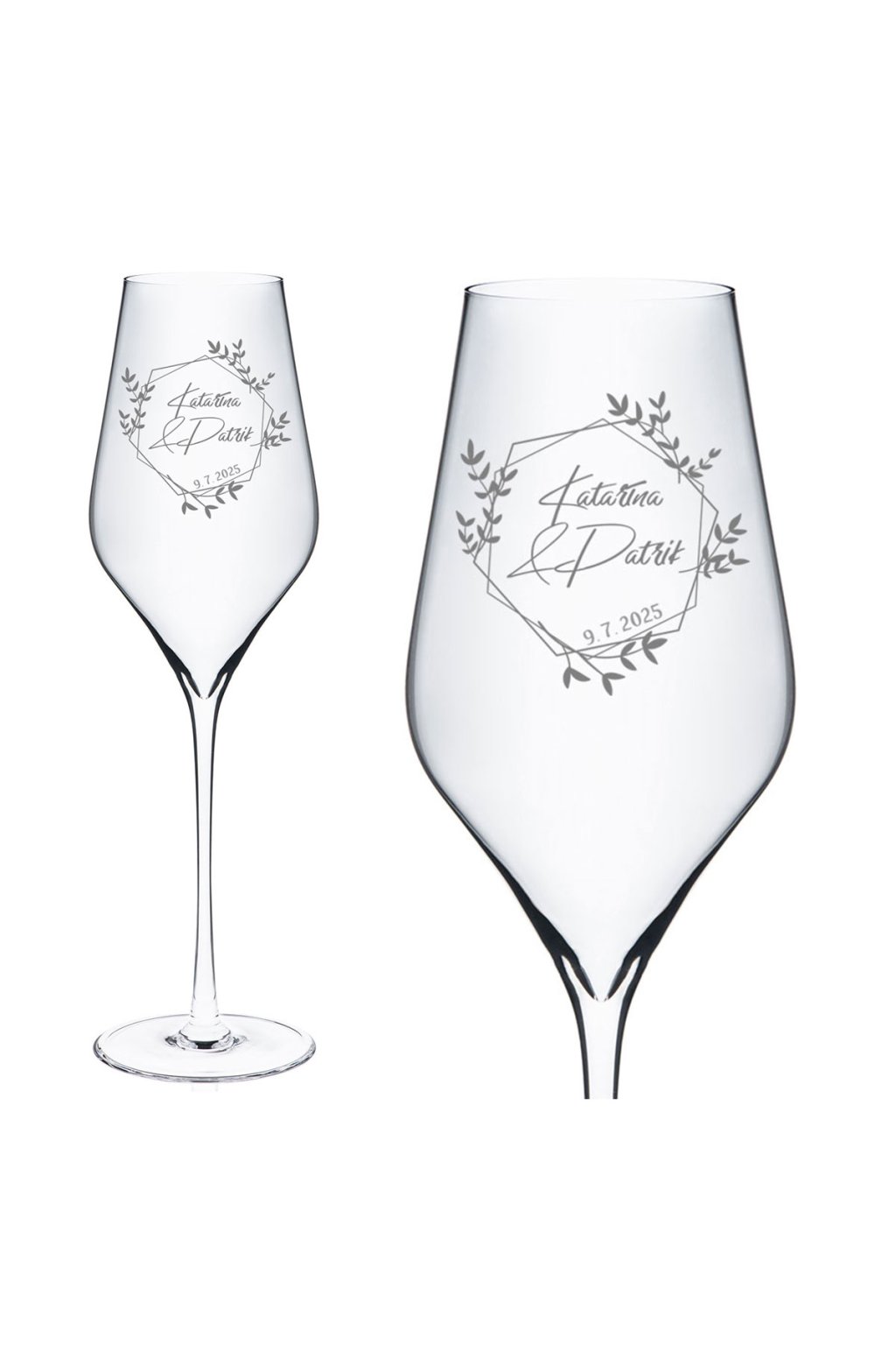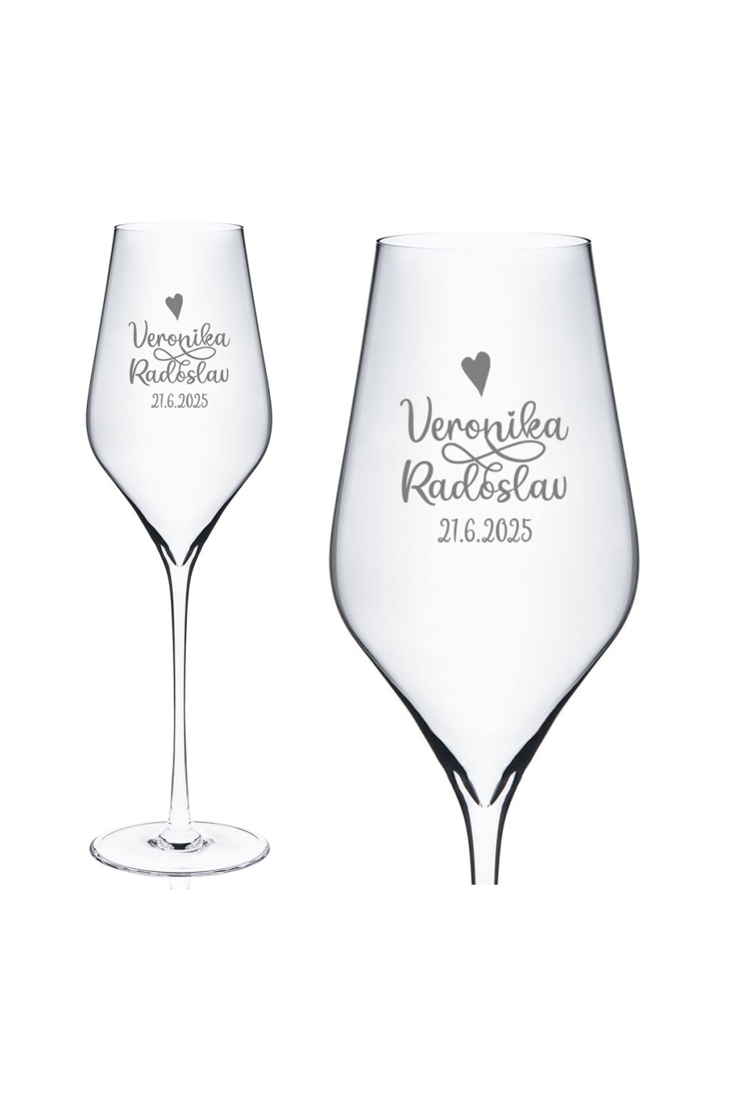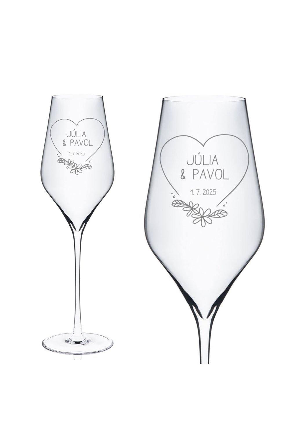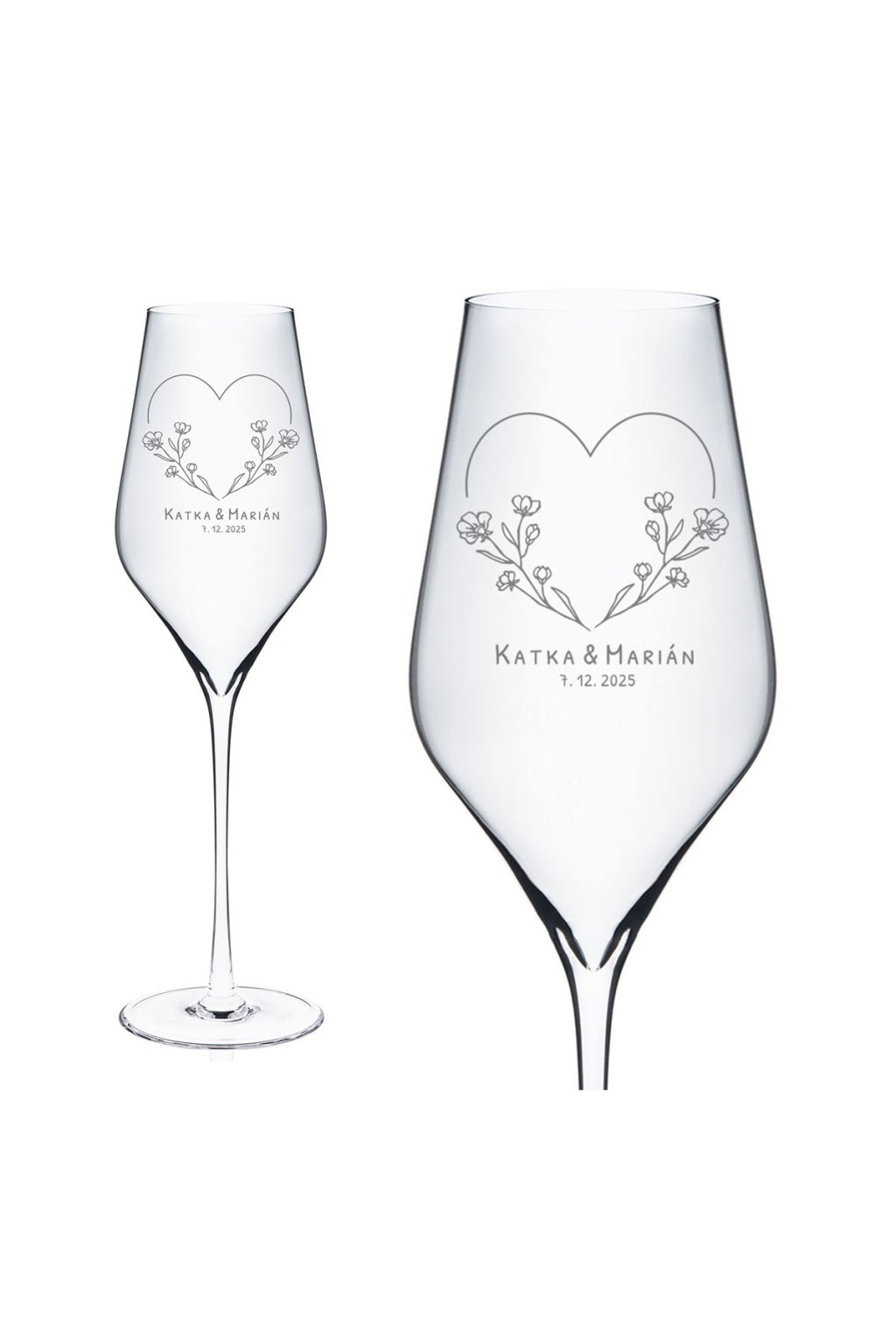 Elegantné poháre na šampanské s vysokou nožičkou a originálnym tvarom kalicha sú ideálne na svadbu alebo ako dar pre novomanželov. Objem: 310 ml.