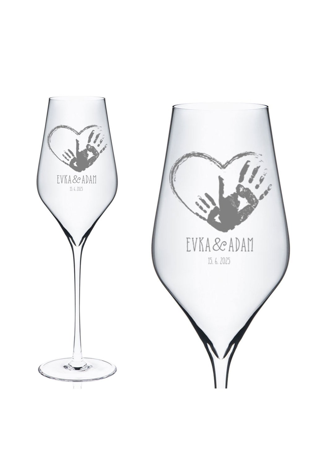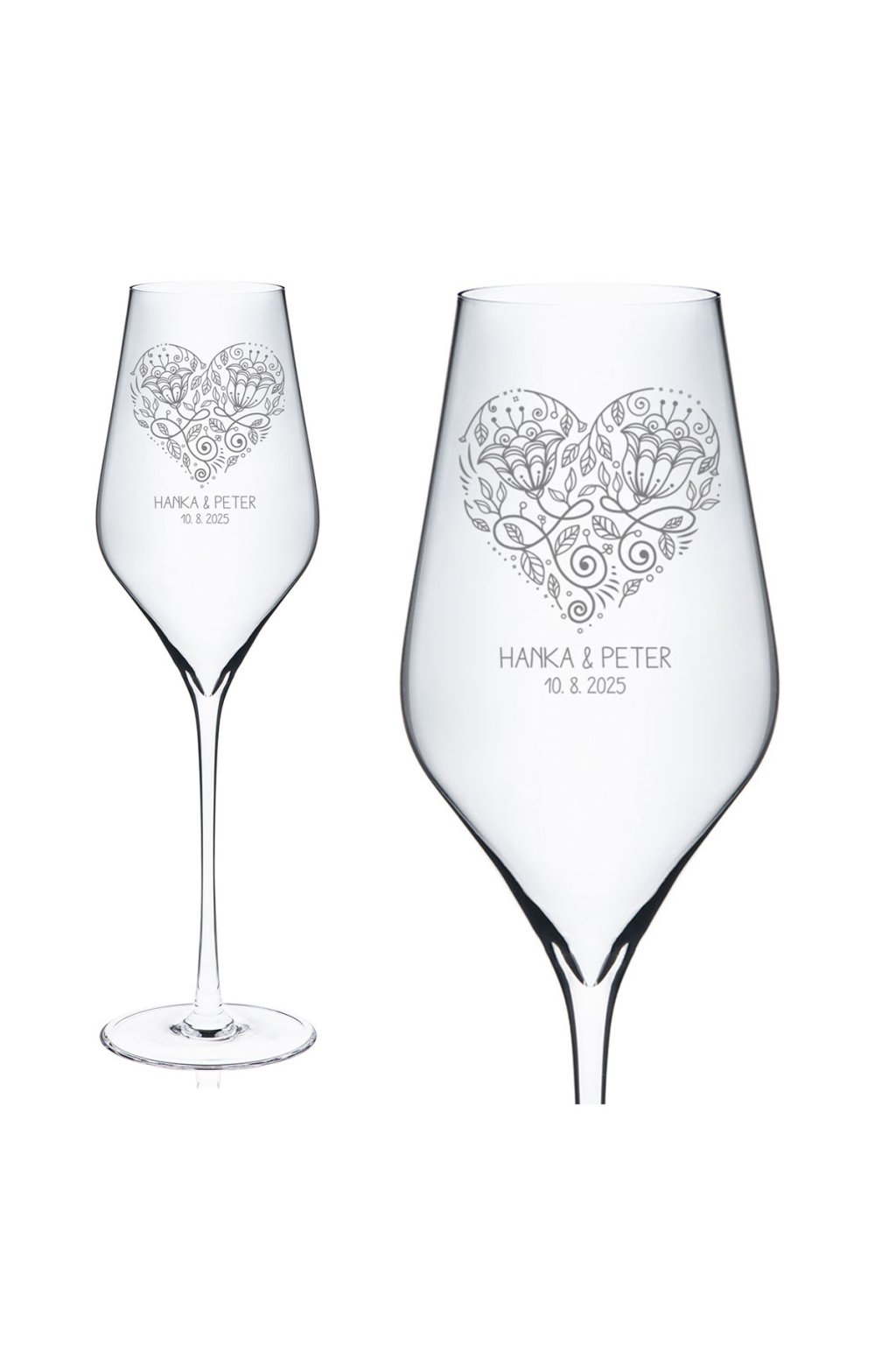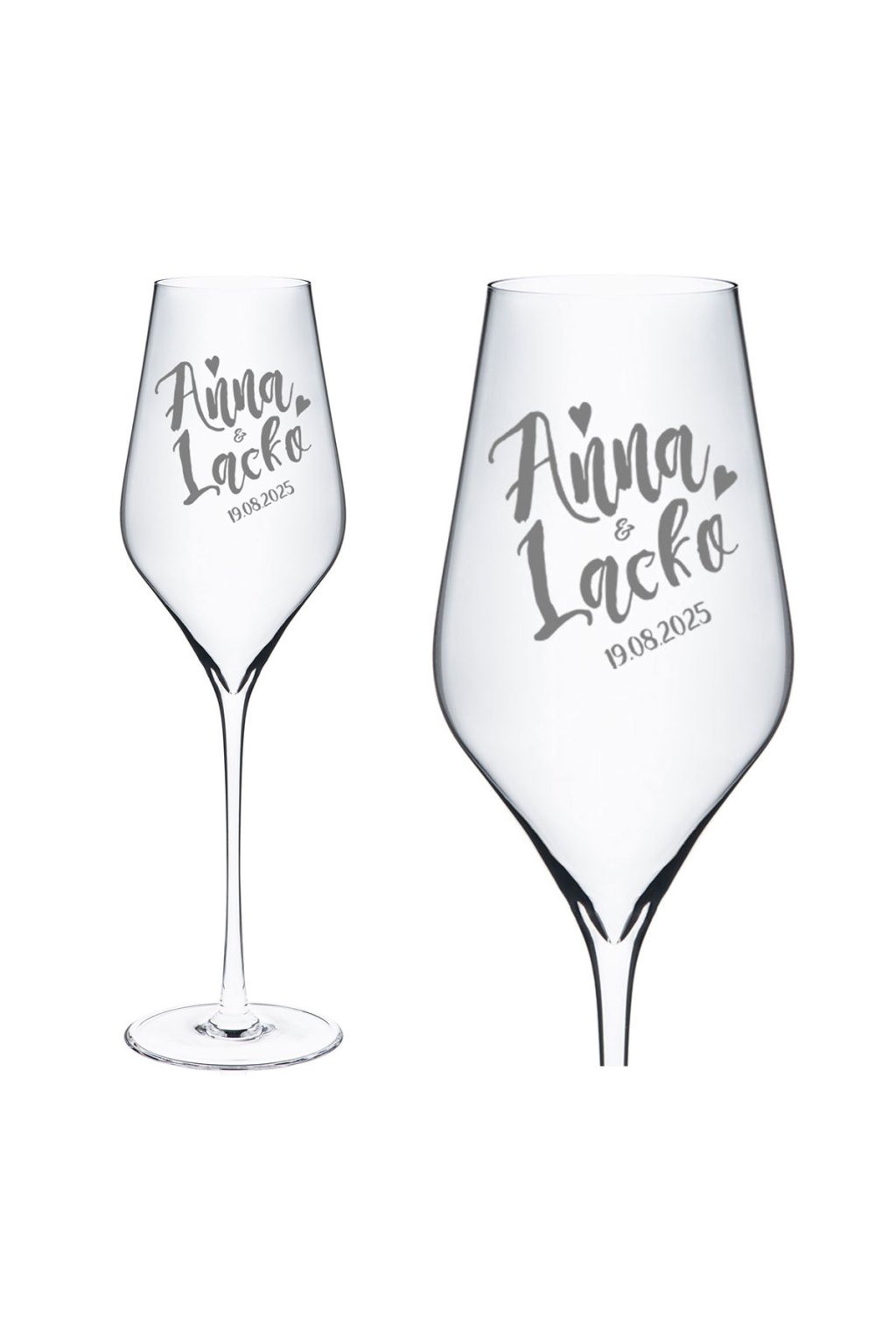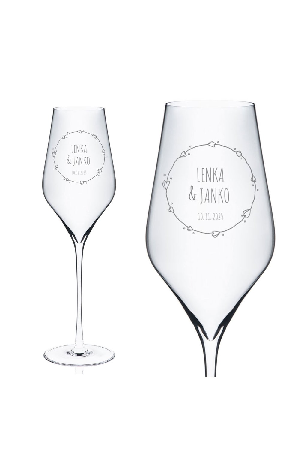 Elegantné poháre na šampanské s vysokou nožičkou a originálnym tvarom kalicha sú ideálne na svadbu alebo ako dar pre novomanželov. Objem: 310 ml.
