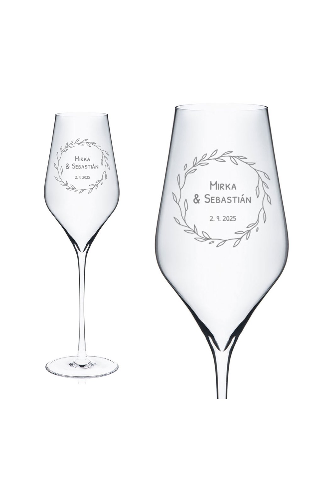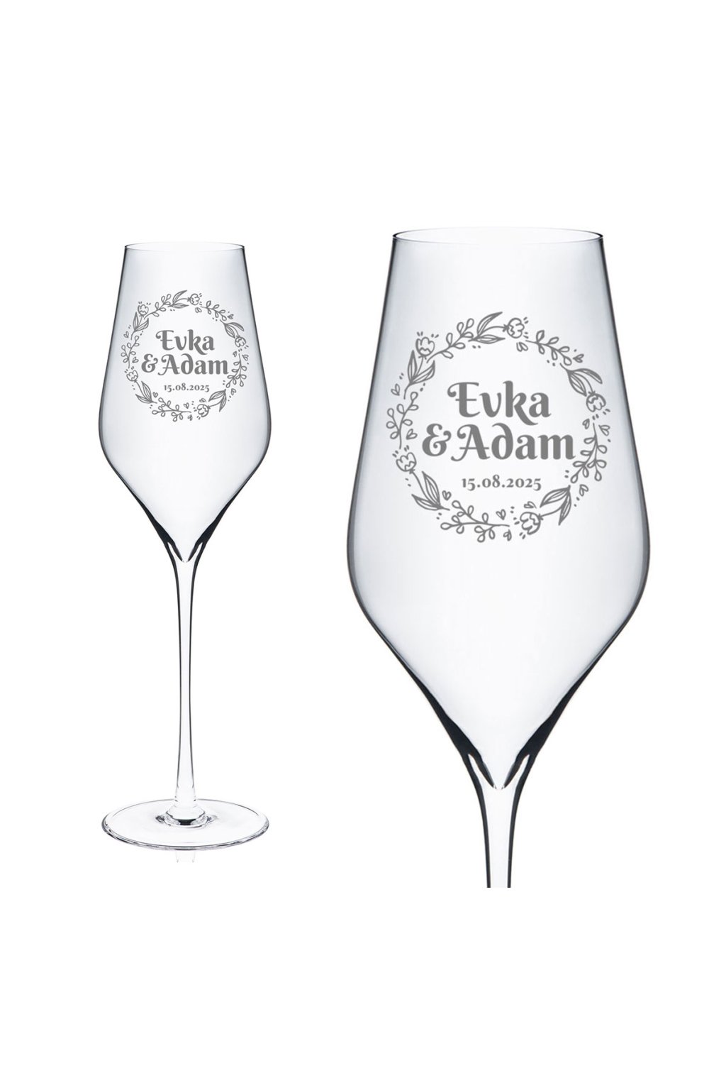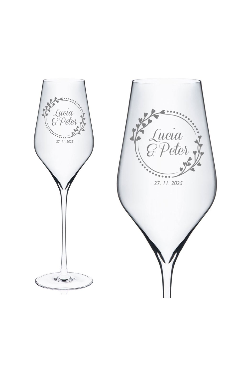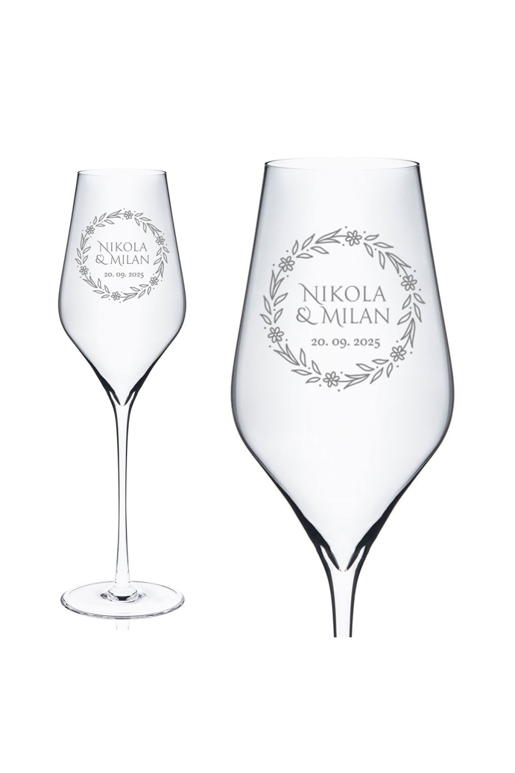 Elegantné poháre na šampanské s vysokou nožičkou a originálnym tvarom kalicha sú ideálne na svadbu alebo ako dar pre novomanželov. Objem: 310 ml.