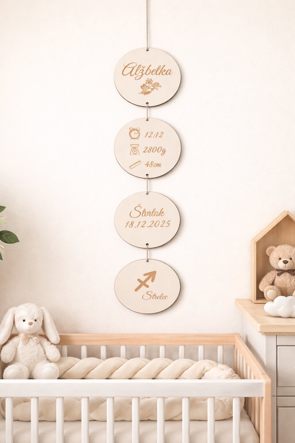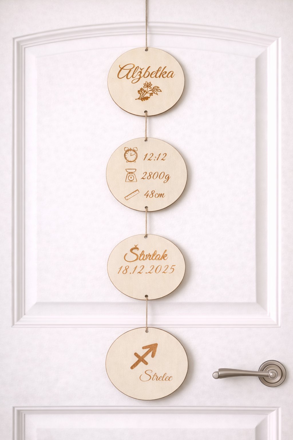 Horný kruh je zdobený menom dieťatka, druhý kruh obsahujú dôležité údaje o narodení (čas, váha a dĺžka), tretí kruh je venovaný dátumu narodenia. Spodný kruh je doplnený o znamenie zverokruhu, čo robí dekoráciu ešte osobnejšou a výnimočnou. Všetky motívy sú precízne gravírované laserom, čo zaručuje vysokú detailnosť a dlhú životnosť bez vyblednutia.