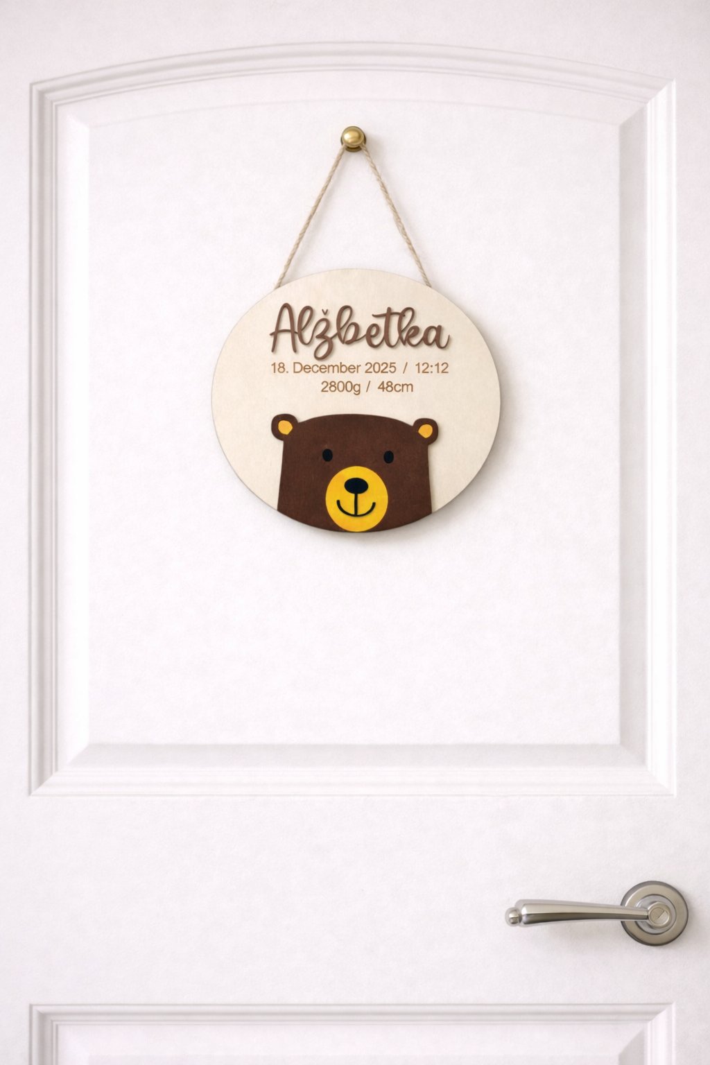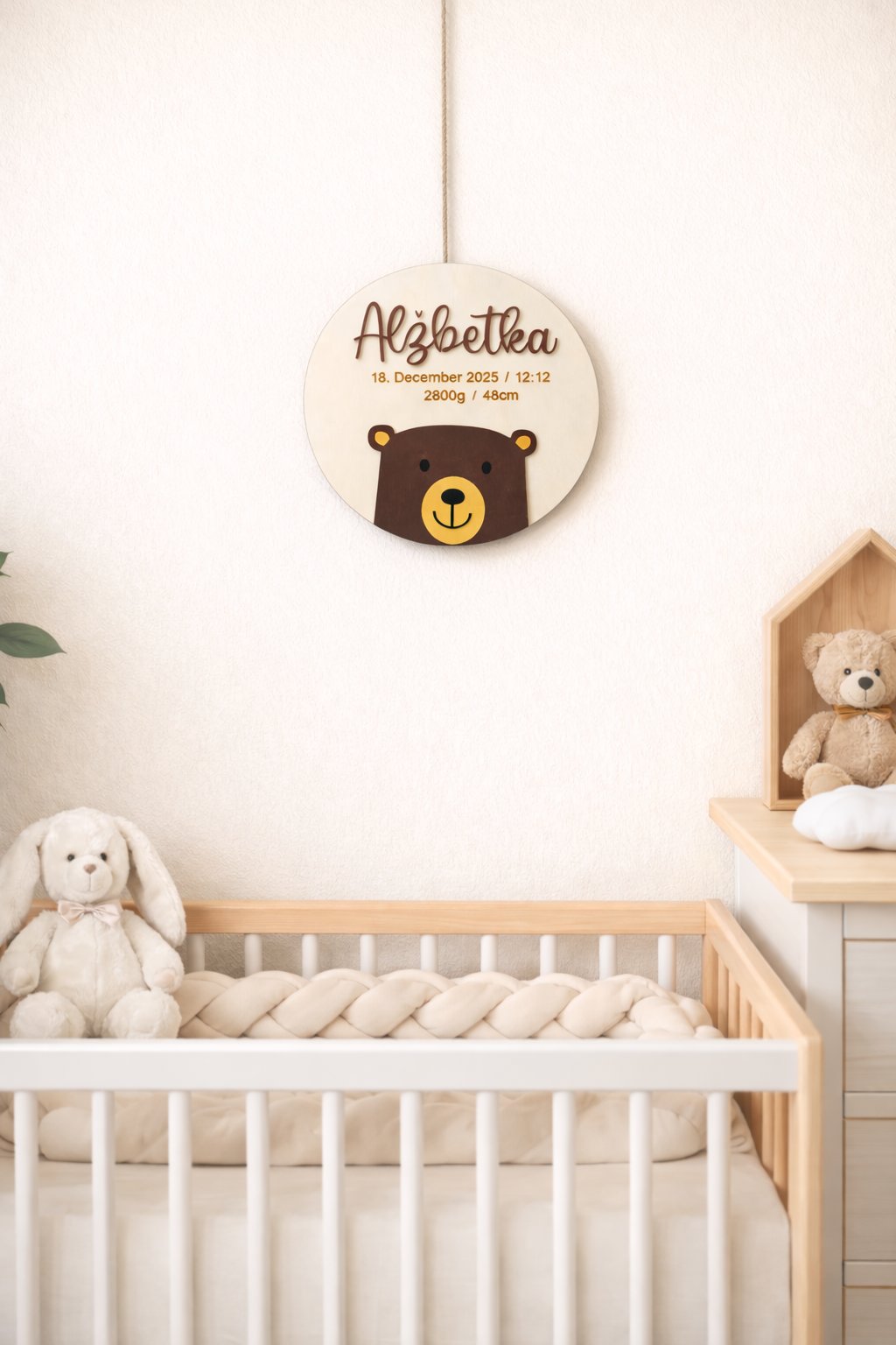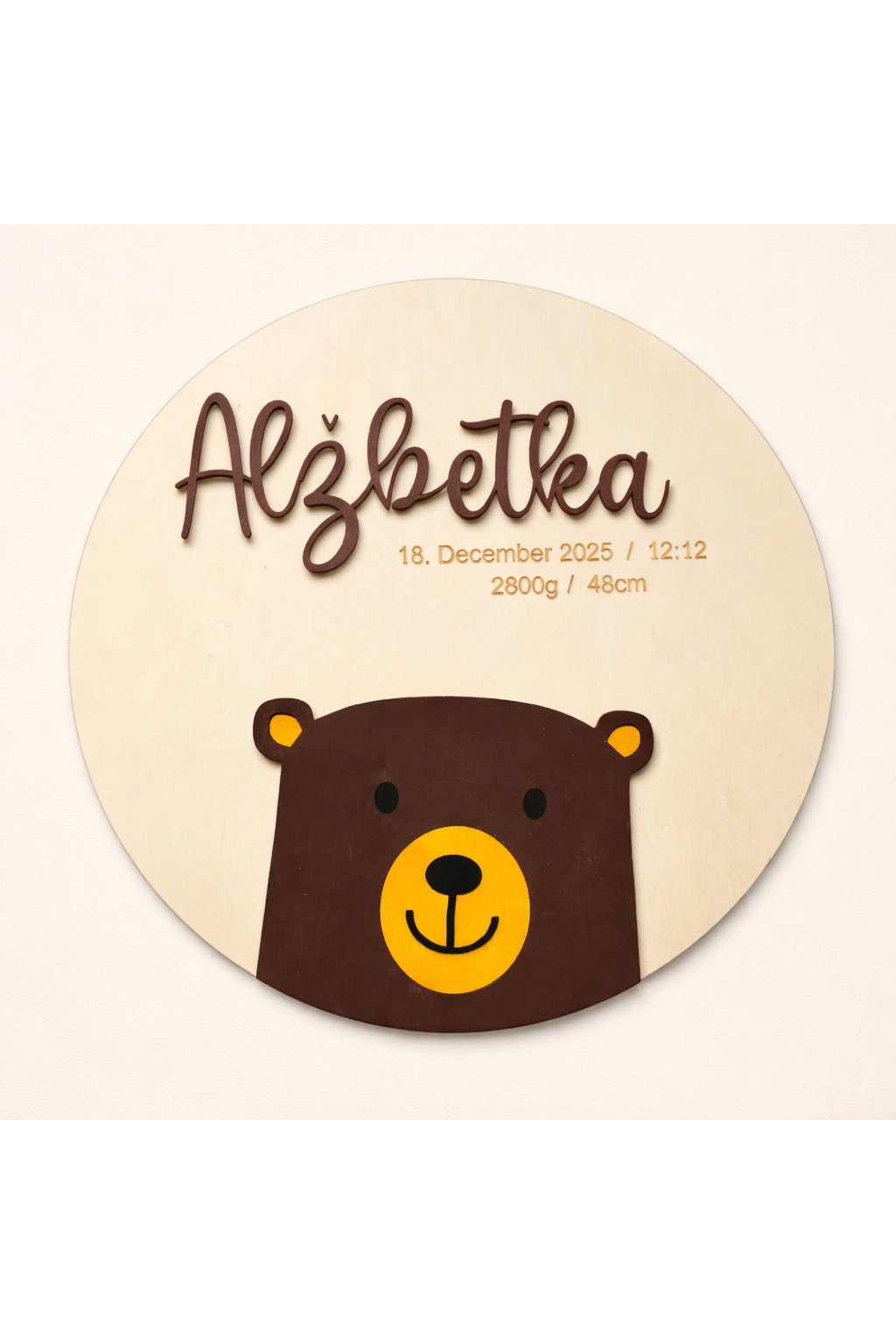 Roztomilá personalizovaná tabuľka s menom dieťaťa, vyrobená z kvalitnej drevenej preglejky, je krásnym doplnkom do detskej izbičky. Jemný dizajn s mackom a gravírovanými údajmi o narodení vytvára milú pamiatku na celý život a originálny darček k narodeniu bábätka. 🧸💛