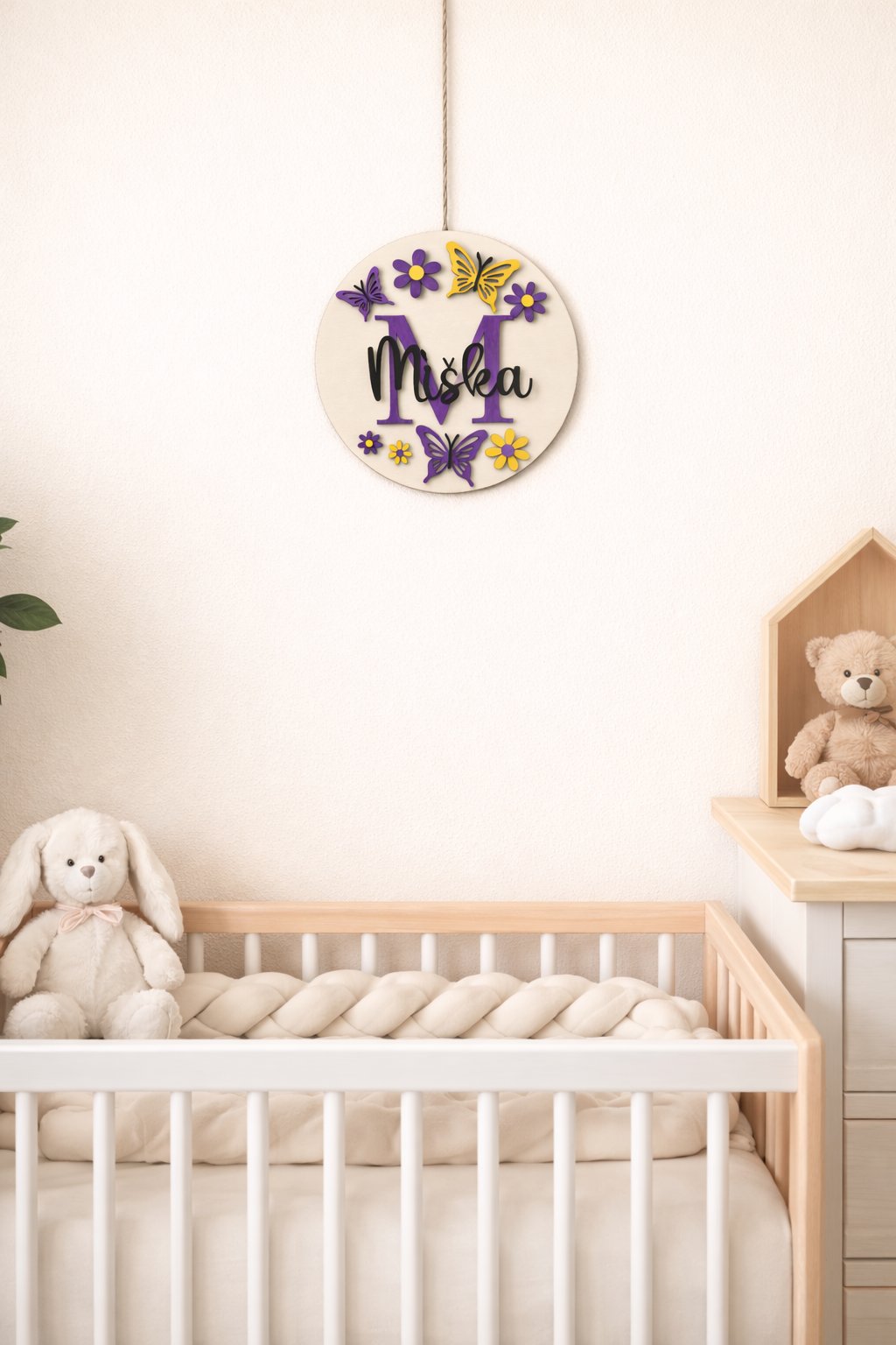 Originálna dekorácia vyrobená z kvalitnej preglejky, zdobená motýľmi a kvetmi. Každý detail je ručne maľovaný akrylovými farbami, vďaka čomu je každý kus jedinečný a plný farieb. Ideálna ako krásny doplnok do detskej izby.