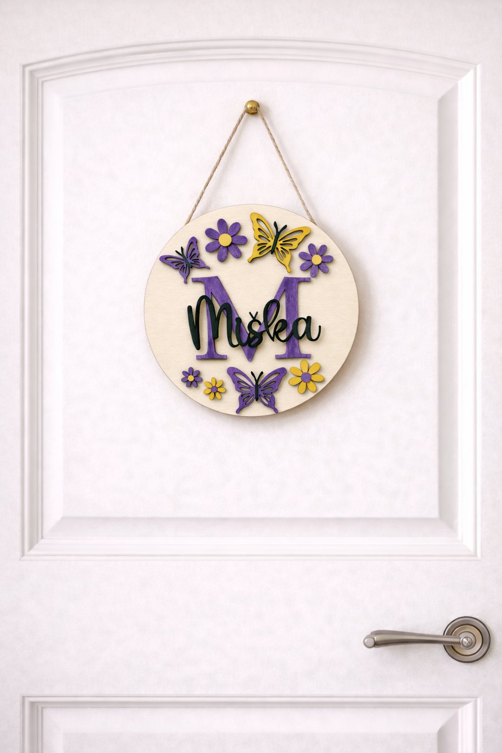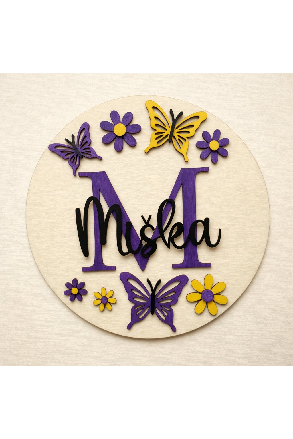 Táto originálna dekorácia je vyrobená z kvalitnej topoľovej preglejky a navrhnutá s dôrazom na detail a remeselné spracovanie. Dominantným prvkom je personalizované písmeno doplnené menom, ktoré je precízne vyrezané a vytvára elegantný 3D efekt. Celý motív je doplnený jemnými kvetmi a motýľmi, ktoré dodávajú dekorácii hravý a zároveň vkusný vzhľad.